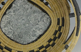 This basket I just finished this week. Summer weather in Florida keeps me inside during mid day so it's a perfect time to listen to a good book and sew. This basket is a double construction. That means there are two baskets: inside with Florida Long Leaf pine needles and outside with the Muhly Grass that I grow. I like to make the two forms compliment each other but still retain their own form. The base stone is Serpentine in shades of green and white. Large Brazilian Rain Forest Jasper pendants adorn the outside form while smaller Green Jasper beads add interest to the green netting and pine needles on the inside. This particular basket has been claimed by a close friend and will travel to California.